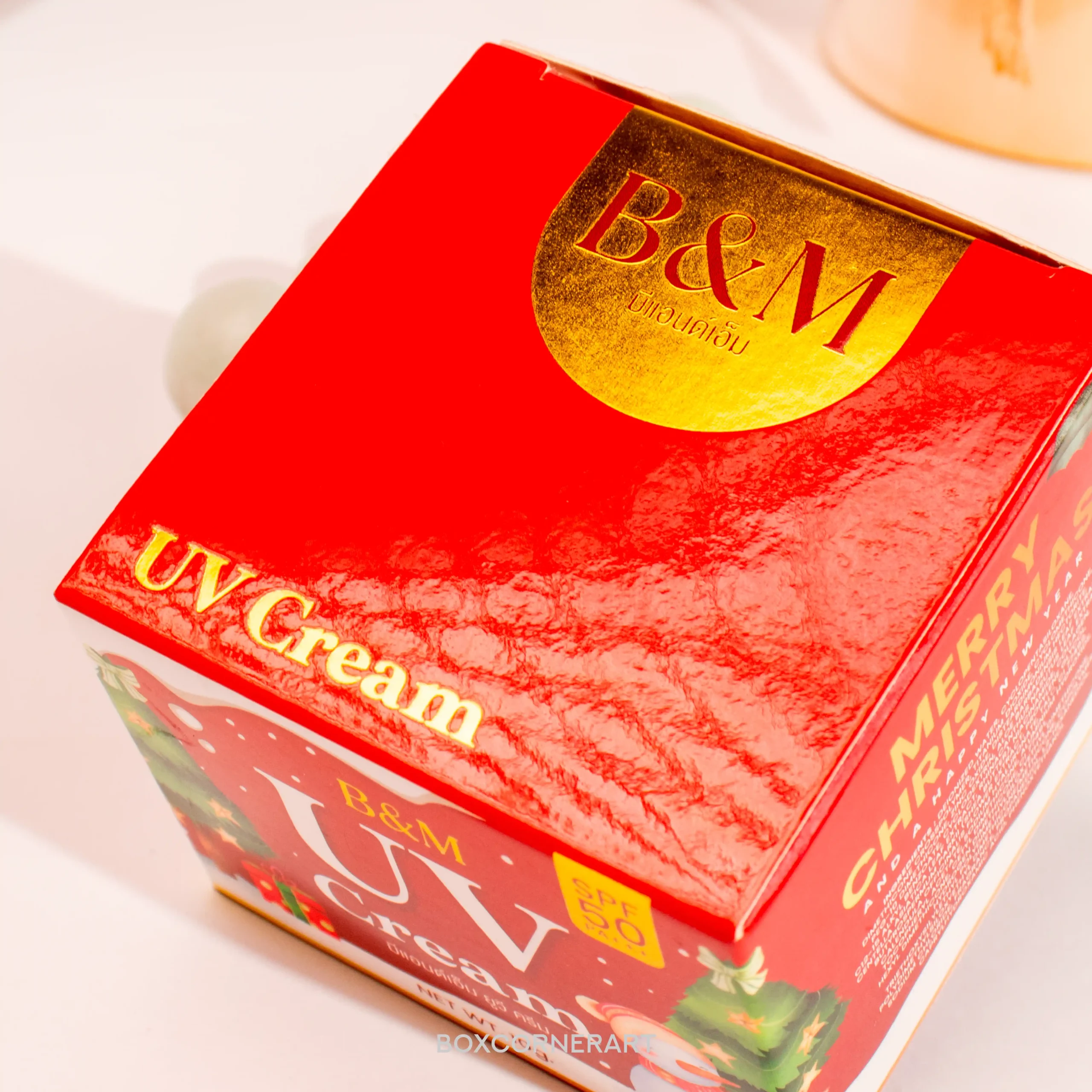 งานพิมพ์ฟอยล์ทอง (Gold Foil Stamping): เพิ่มมูลค่าให้กล่องดูแพงและพิเศษยิ่งขึ้น ด้วยเทคนิคปั๊มเคทองเงาวาวที่ตัวอักษร “UV”, “Merry Christmas” และโลโก้แบรนด์ ตัดกับพื้นสีแดงอย่างลงตัว